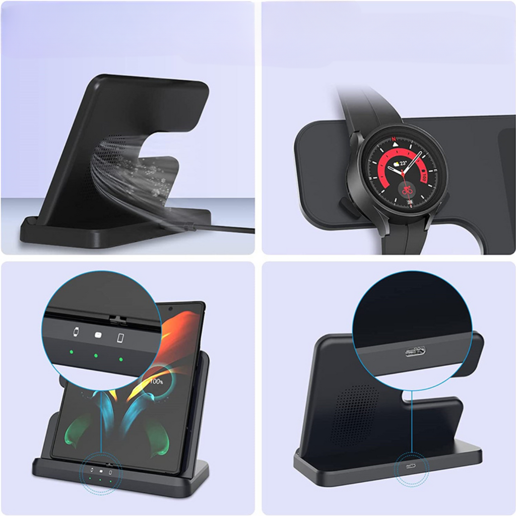 O Carregador Sem Fio Samsung 3 em 1 – Fast Charge foi desenvolvido para carregar smartphone + smartwatch + fones ao mesmo tempo, com eficiência máxima.